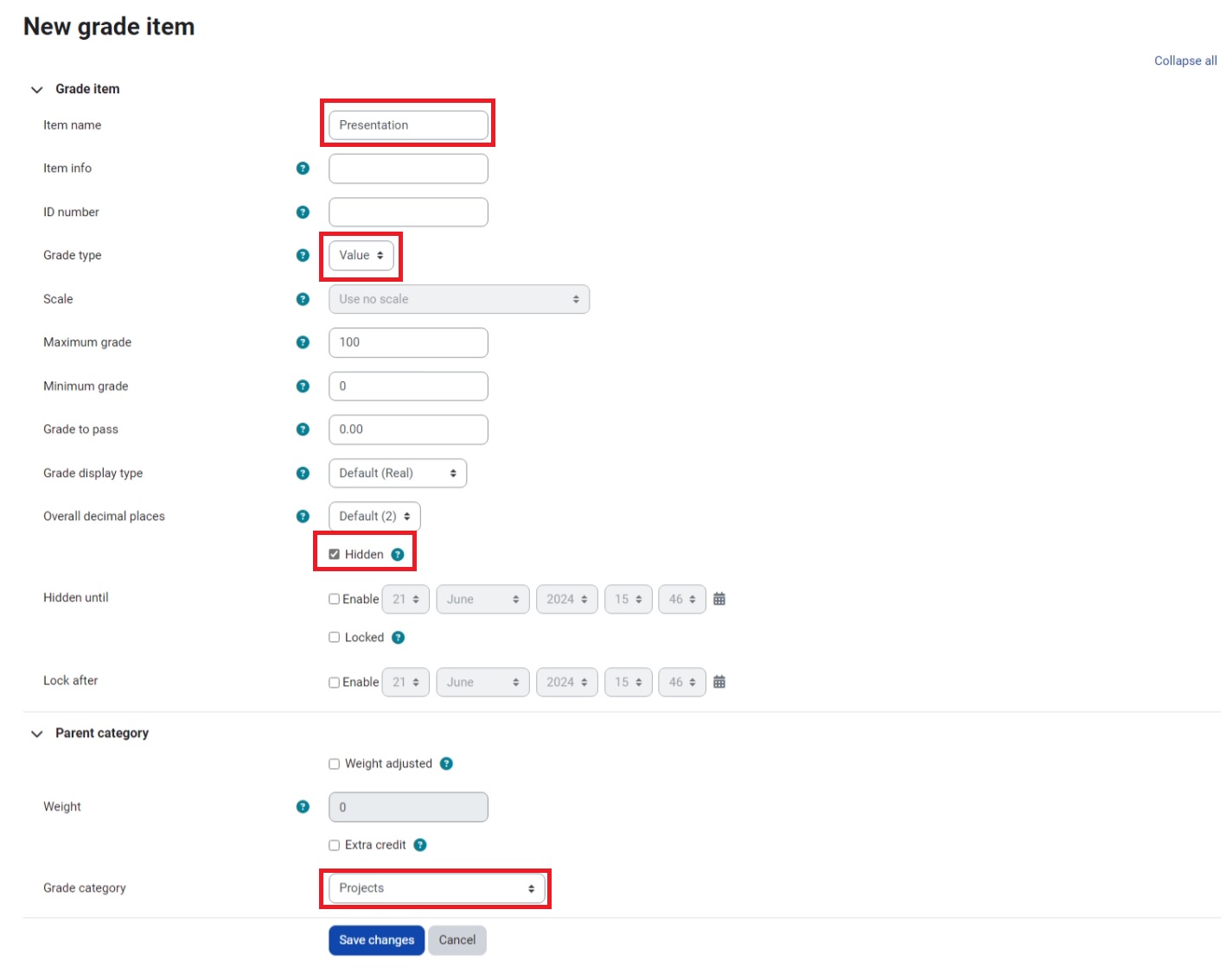 Any graded activity in Moodle – assignments, quizzes, discussion forums with ratings, etc – are automatically added to the gradebook with a grade value as specified in the activity settings. Oftentimes, however, you may wish to add a standalone grade item to the Moodle gradebook. This essentially adds an item to your gradebook that is not associated with any online activity in Moodle. This is often used to track grades for “intangible” student work like class participation or in-class presentations.