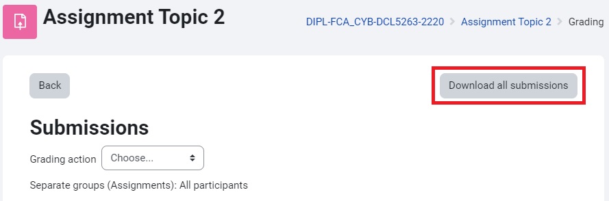 This guide demonstrates how submissions for a Moodle assignment can be downloaded in bulk as a ZIP file.
