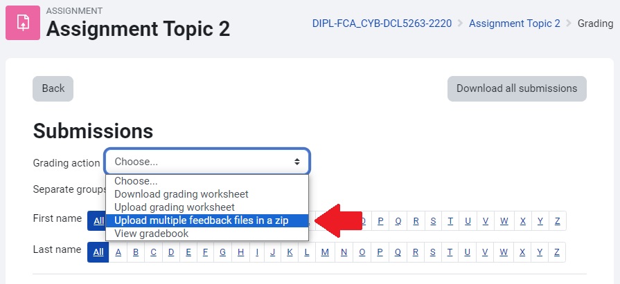 Before you upload assignment feedback files, you will first need to have downloaded the submissions. For information about downloading student assignment submissions, see the Bulk Download Assignment Submissions guide.