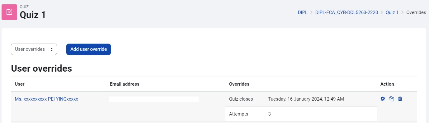 This guide shows how to have a different quiz close date for a specific individual, but the process is the same for overriding other quiz settings. Note that you cannot override the “Expect completed on” date.