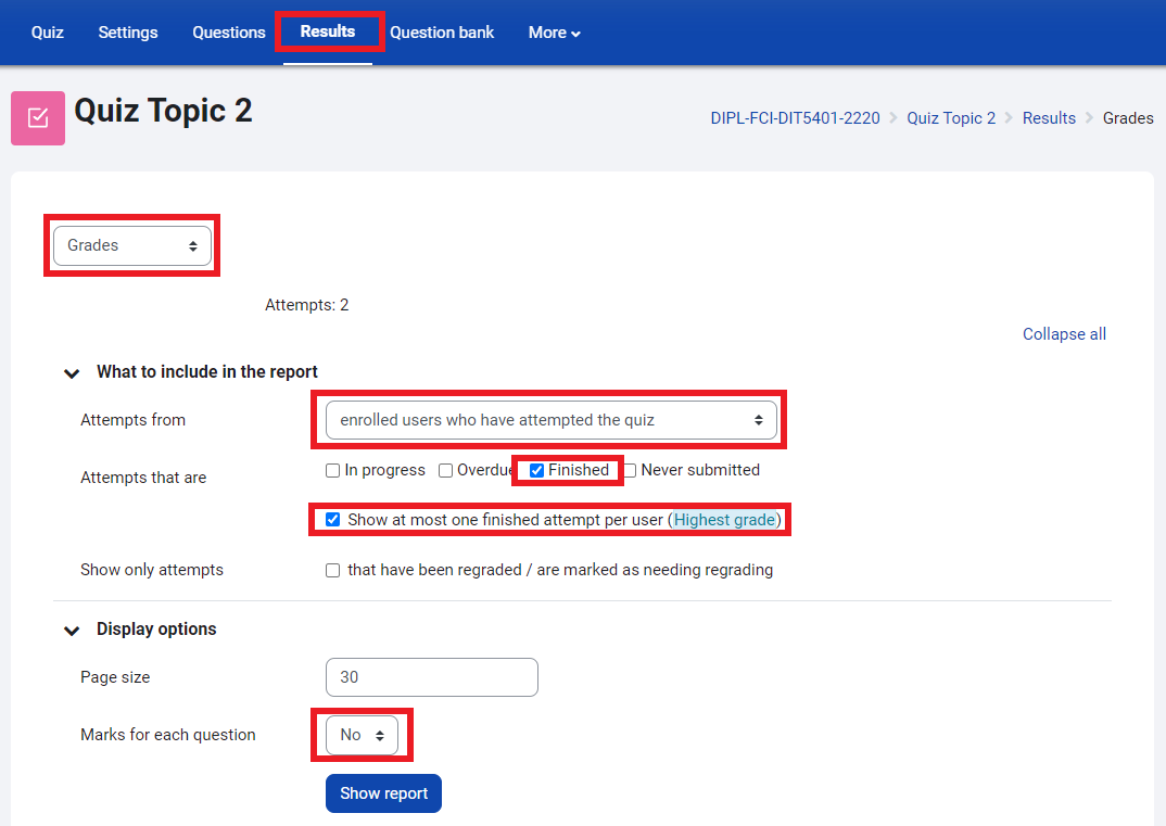 - Check the box for Show at most one finished attempt per user.