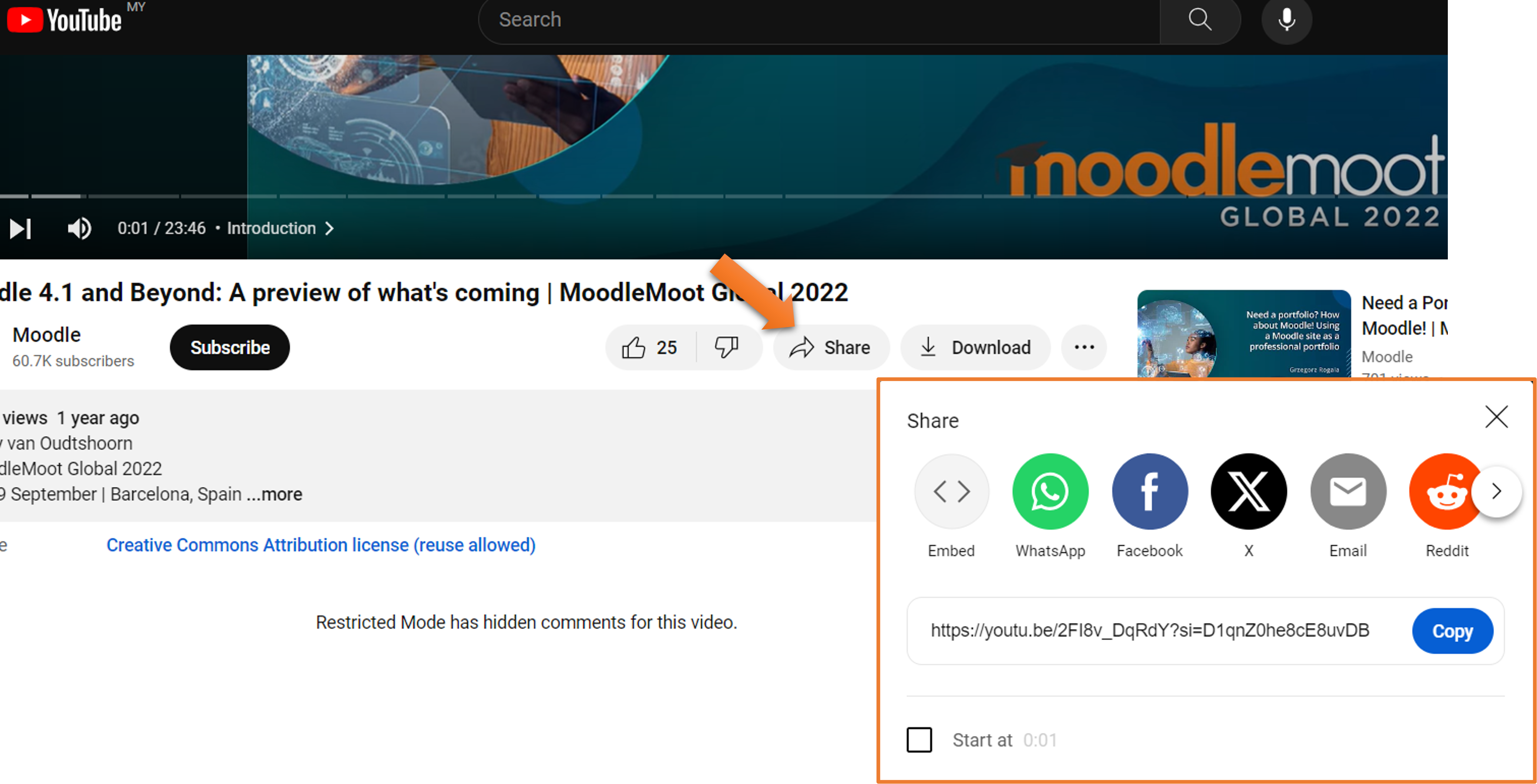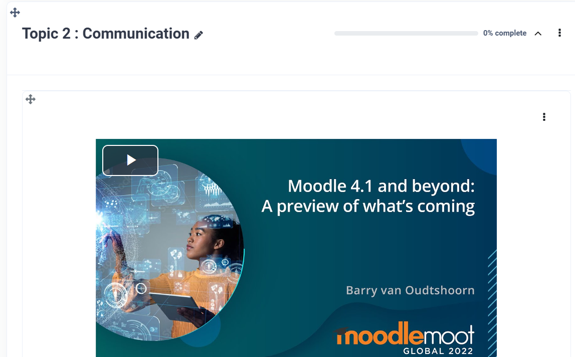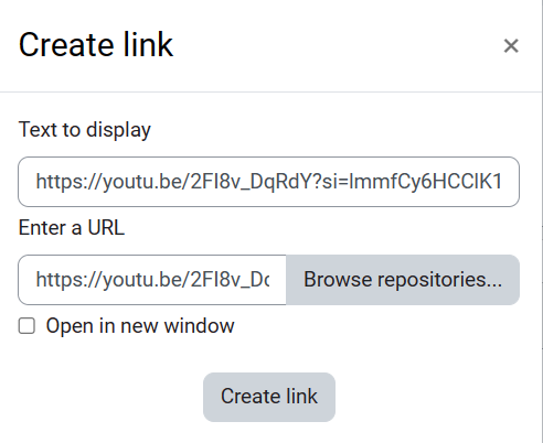 In Moodle, you can embed a YouTube video simply by adding a link to the video. This works anywhere you can add text – for instance in a text and media area, page, discussion forum, or activity description.