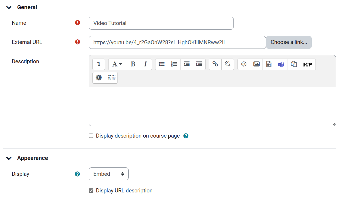 In Moodle, you can embed a YouTube video simply by adding a link to the video. This works anywhere you can add text – for instance in a text and media area, page, discussion forum, or activity description.