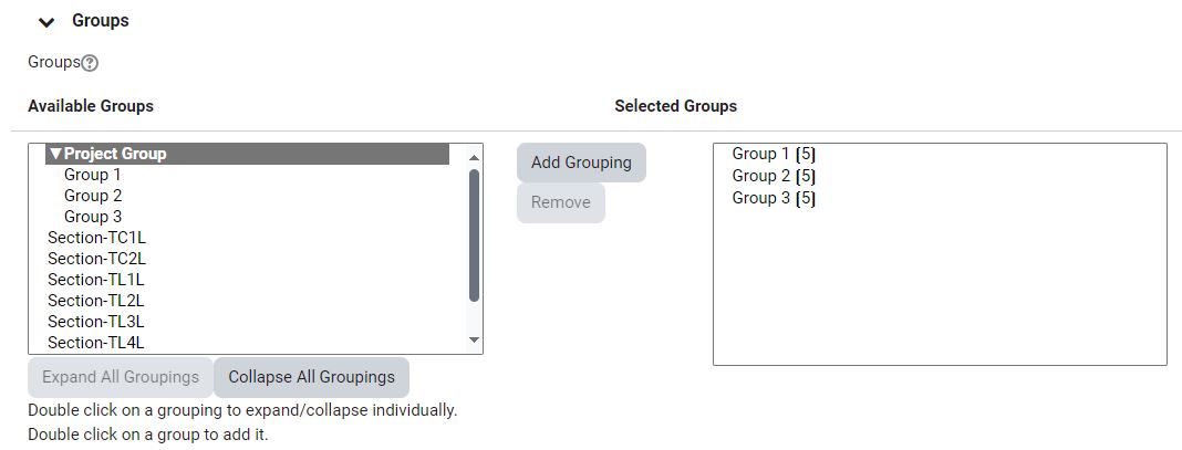 - If a limit for the number of students in each group has been set (under Miscellaneous settings ), the limit will be displayed between brackets next to the group under Selected Groups .