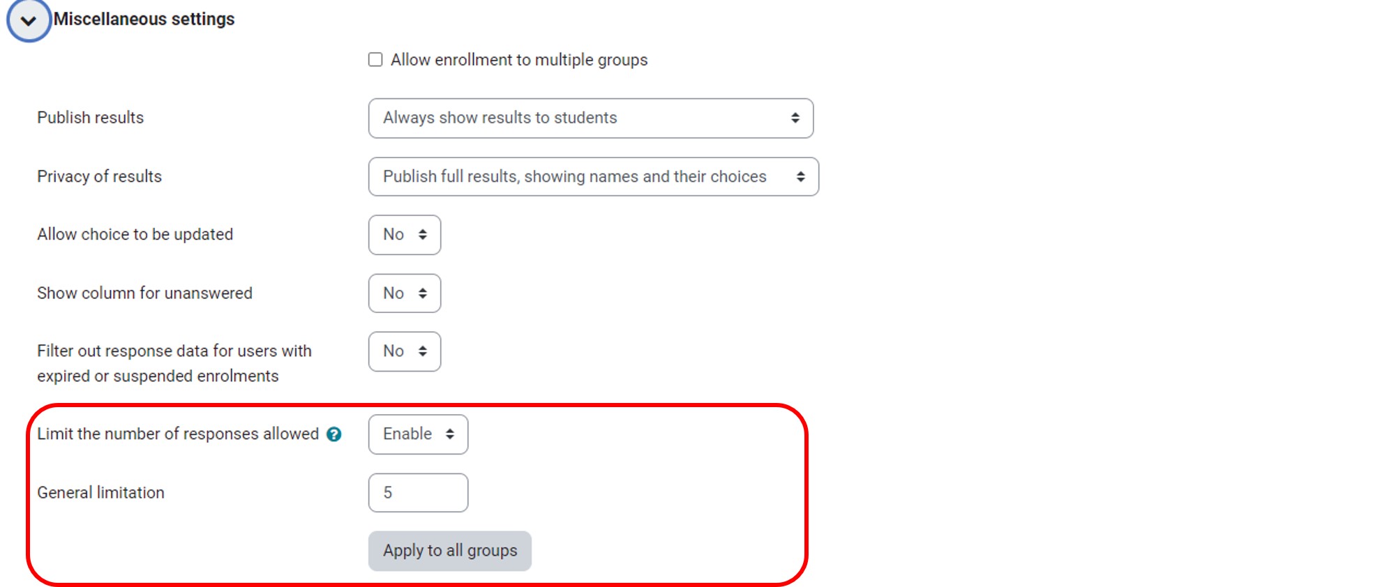 - If Limit the number of responses allowed is set to Enable , a limit for each individual group can be set by selecting the Group name in the Selected Groups column and entering the maximum number of participants in that group in the Limit for Group: input field.