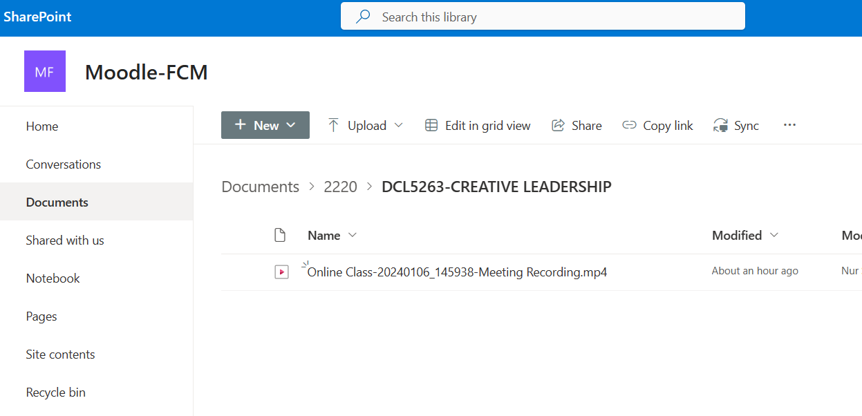 [Faculty Sharepoint] > [Term ID] > [CourseCode-CourseName] for example Moodle-FCM > 2220 > DCL5263-CREATIVE LEADERSHIP