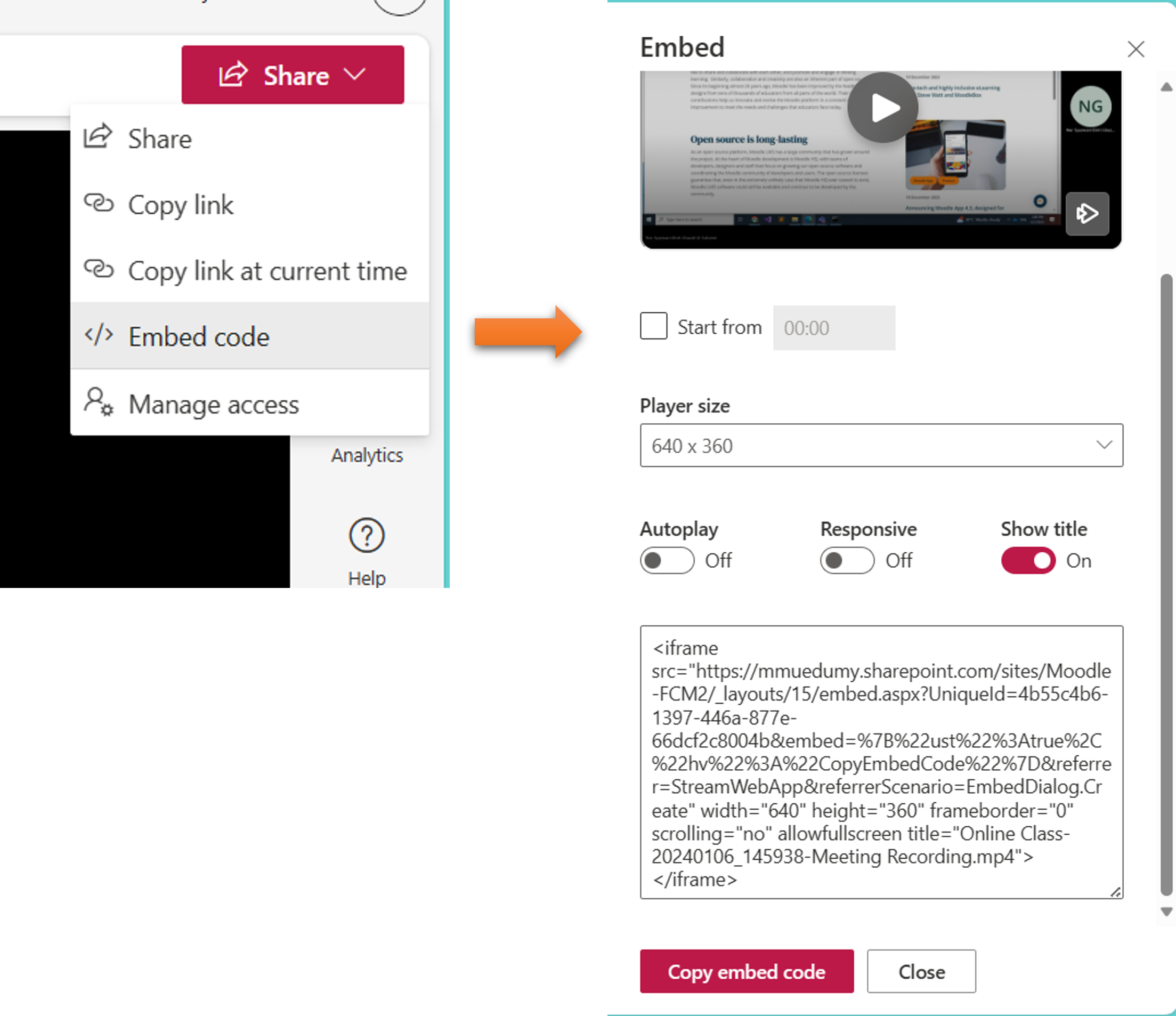Videos from MS SharePoint can be shared by embedded code in the text editor.