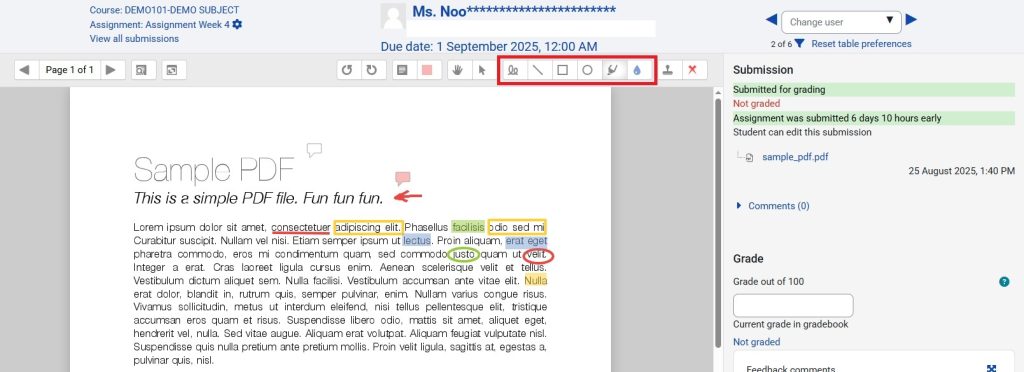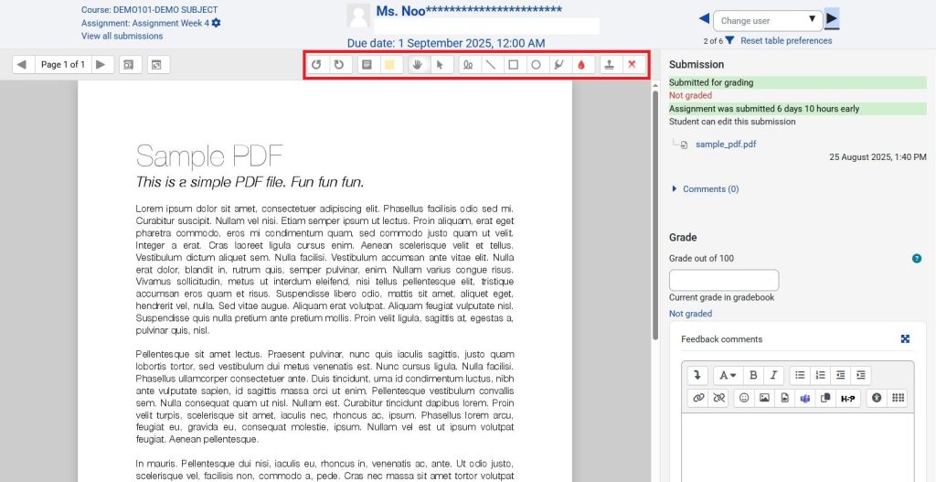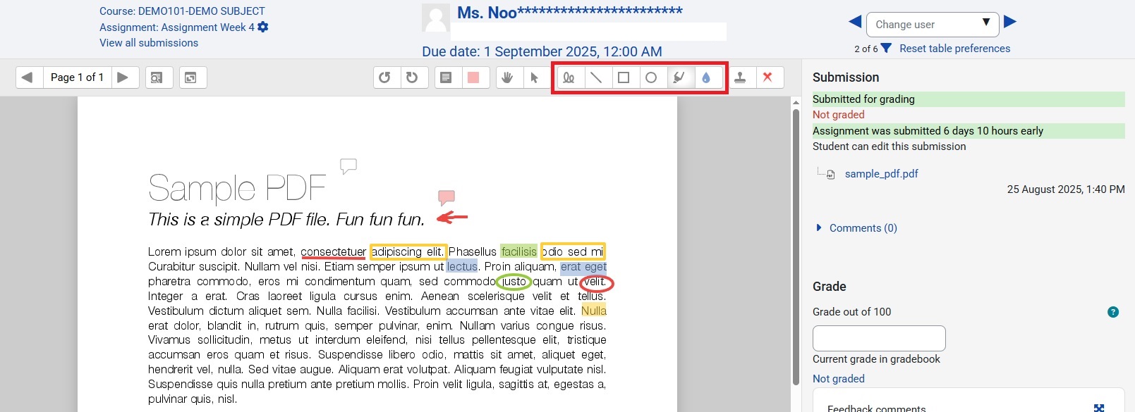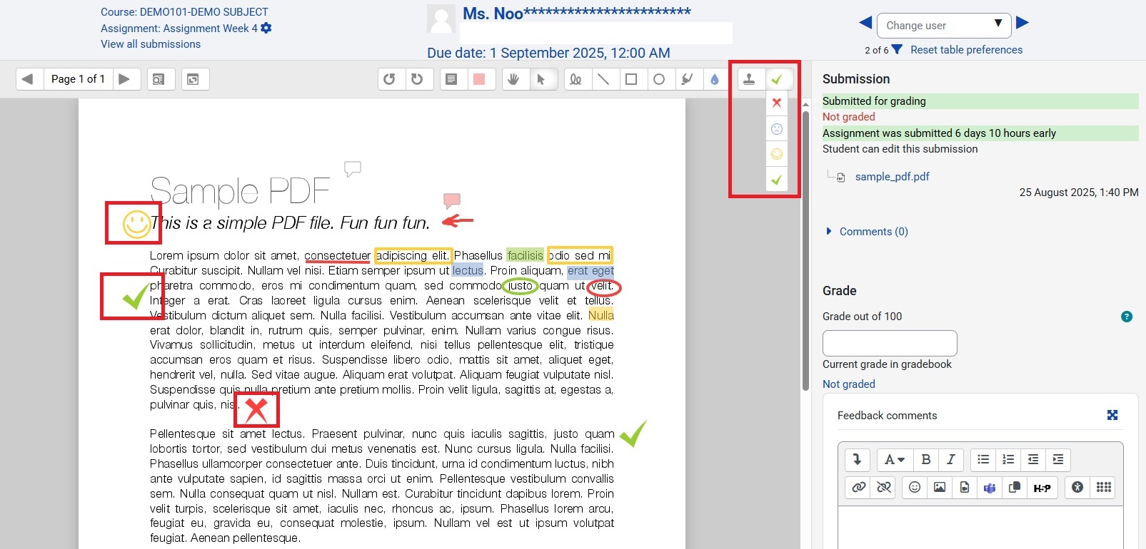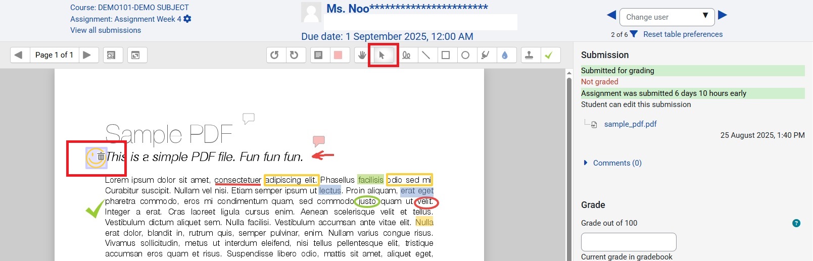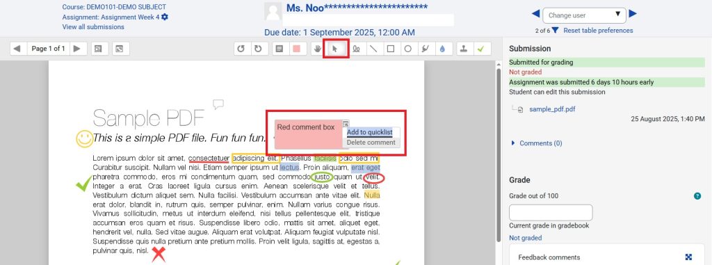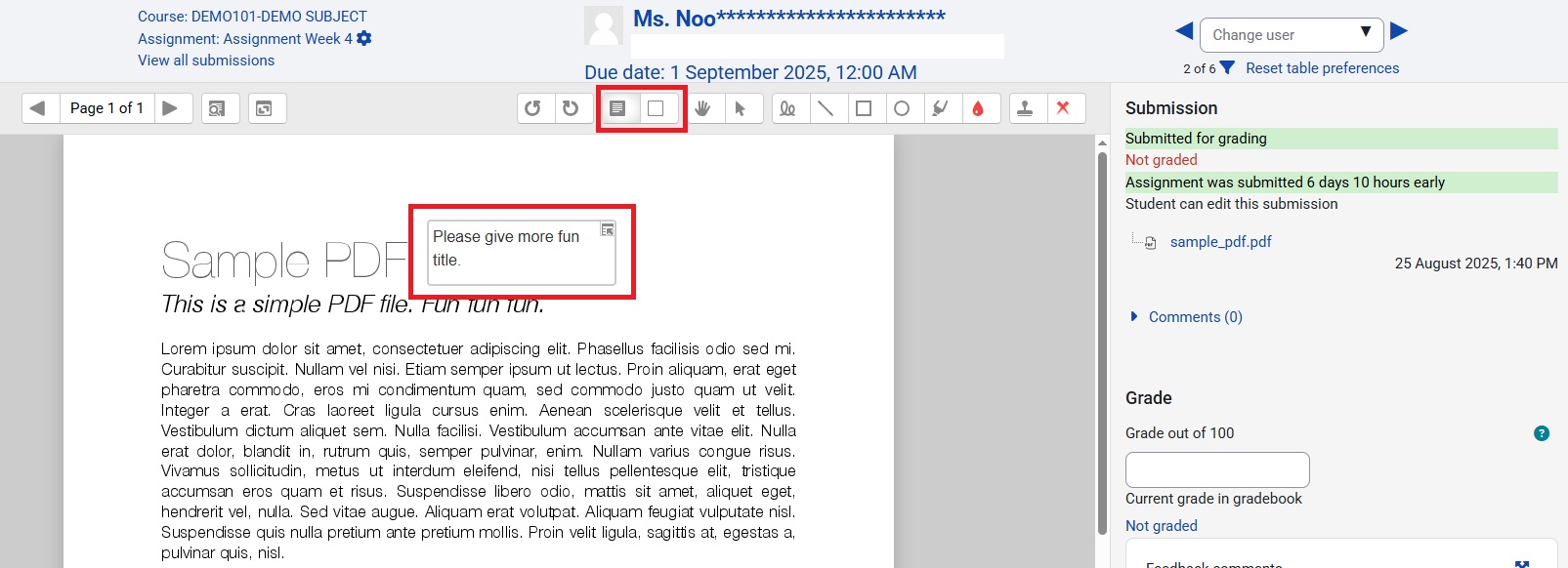 To add a comment, lecturer can click the comment icon and drag a comment box to where you want it. Type your comment into the box.