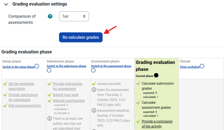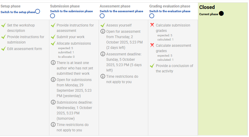 When you are satisfied with the final grading, click the icon or text to close the workshop. The Closed phase will be highlighted and students will be able to see their grades, any published submissions and a conclusion if you added one.