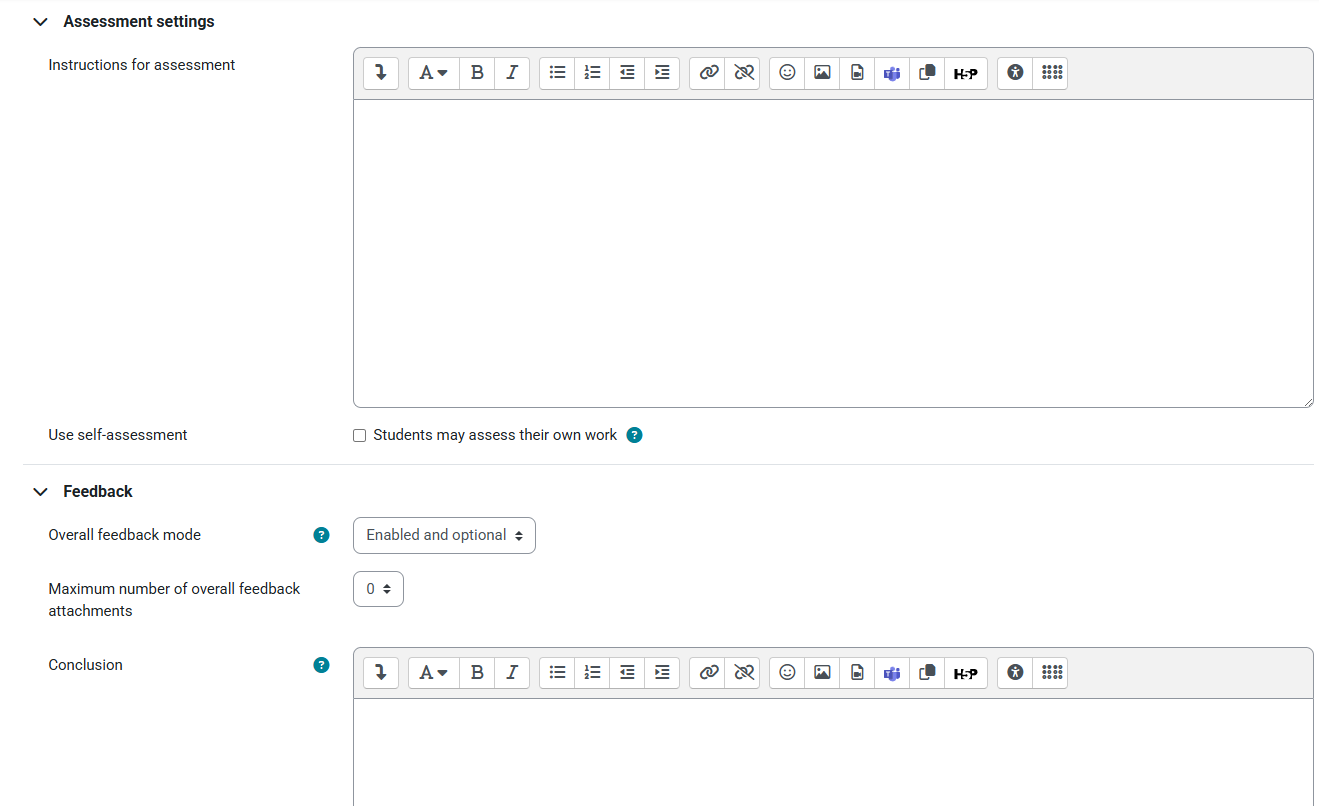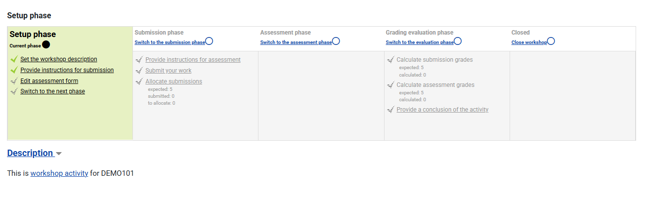 - Click ‘Edit assessment form’ to provide detailed grading criteria for your students to use. When finished, click ‘Save and close’, and all ticks on the Setup phase will be the same colour.