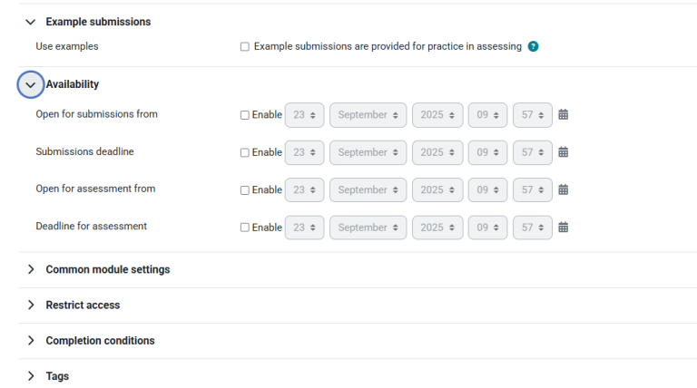 - If, in the Availability section you set the workshop to switch to the submission phase automatically once the submission deadline is over, choose Scheduled allocation.