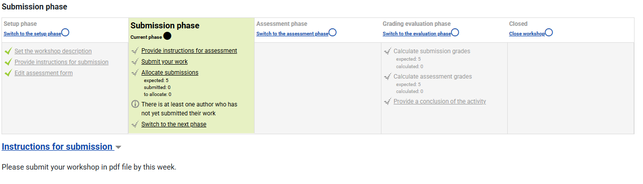 - You can see how many have submitted and how many still need to submit. Click the icon or text to move to the Assessment phase if you chose to switch phases yourself. The phase will be highlighted. (Remember that you can move back a phase if you need to, for example if you want to allow a student to resubmit.)