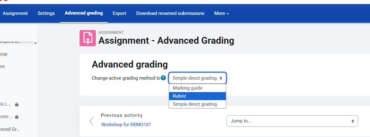 - From the Assignment’s summary page, in its Settings block, click Advanced grading; a new page displays a menu.