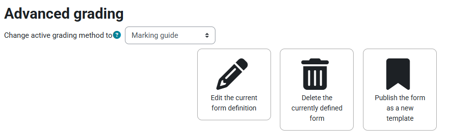 - Once completed, a guide may be edited or deleted by going to Settings>Assignment administration>Advanced grading>Marking guide. Options appear to edit or delete the currently defined form.
