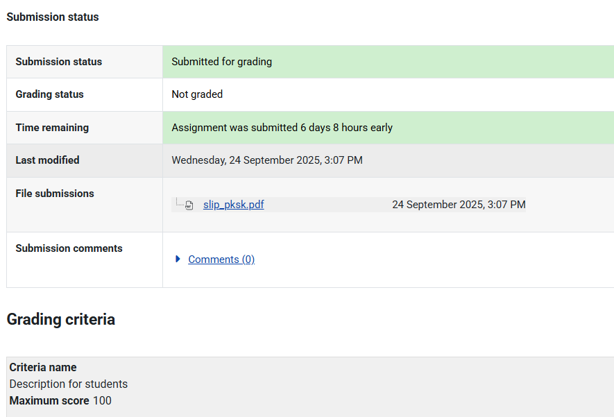 Modules that support advanced grading methods have the grading method selector included in their settings form (for example, in the Assignment settings form). The lecturer can choose either ‘Simple direct grading’ or others method available. Selecting ‘Simple direct grading’ means that the advanced grading is not used and the standard grade selector is displayed.