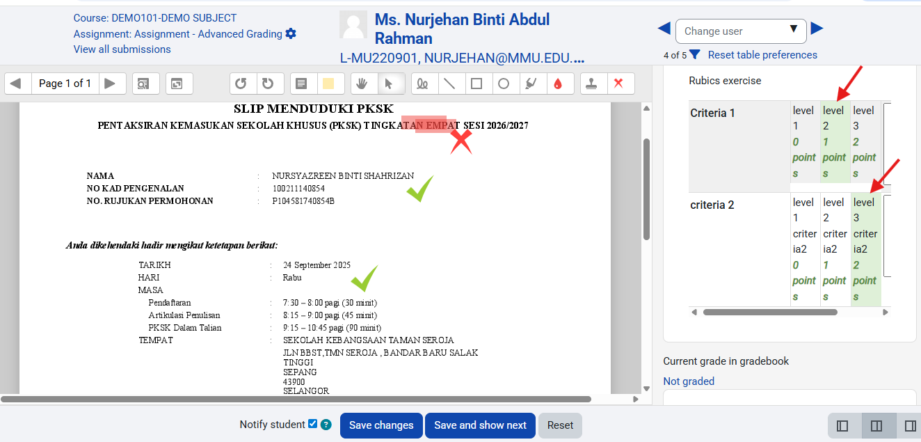 - Save the settings; Rubric is now enabled for that particular Assignment.