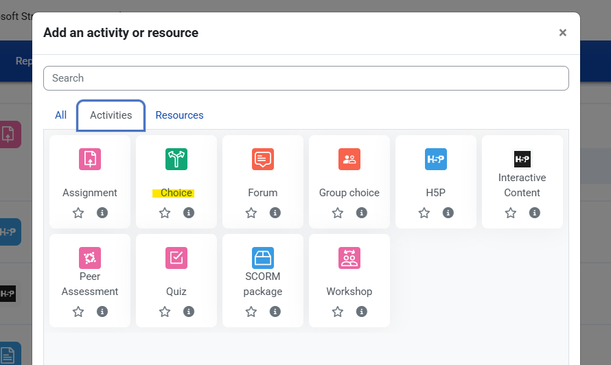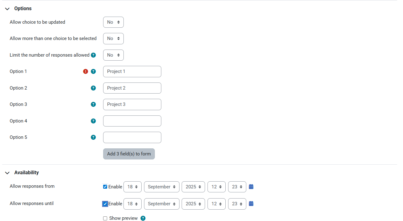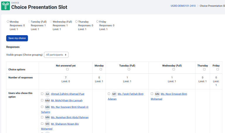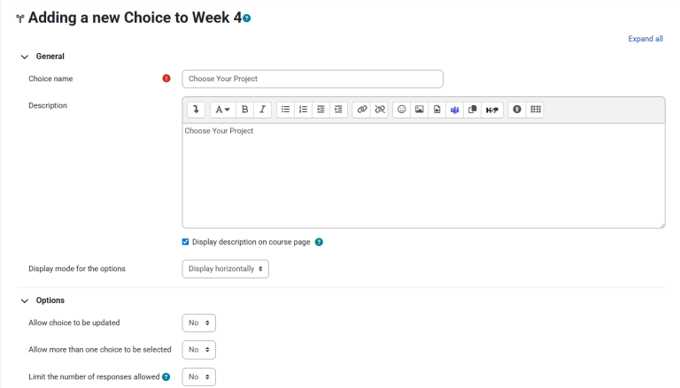 The Choice activity allows you to ask a question and set up radio buttons which learners can click to make a selection from a number of possible responses. You can choose one or more option and you can update their selection if you allow them. Choices can be useful as quick poll to stimulate thinking about a topic; to allow the class to vote on a direction for the course, or to gauge progress.