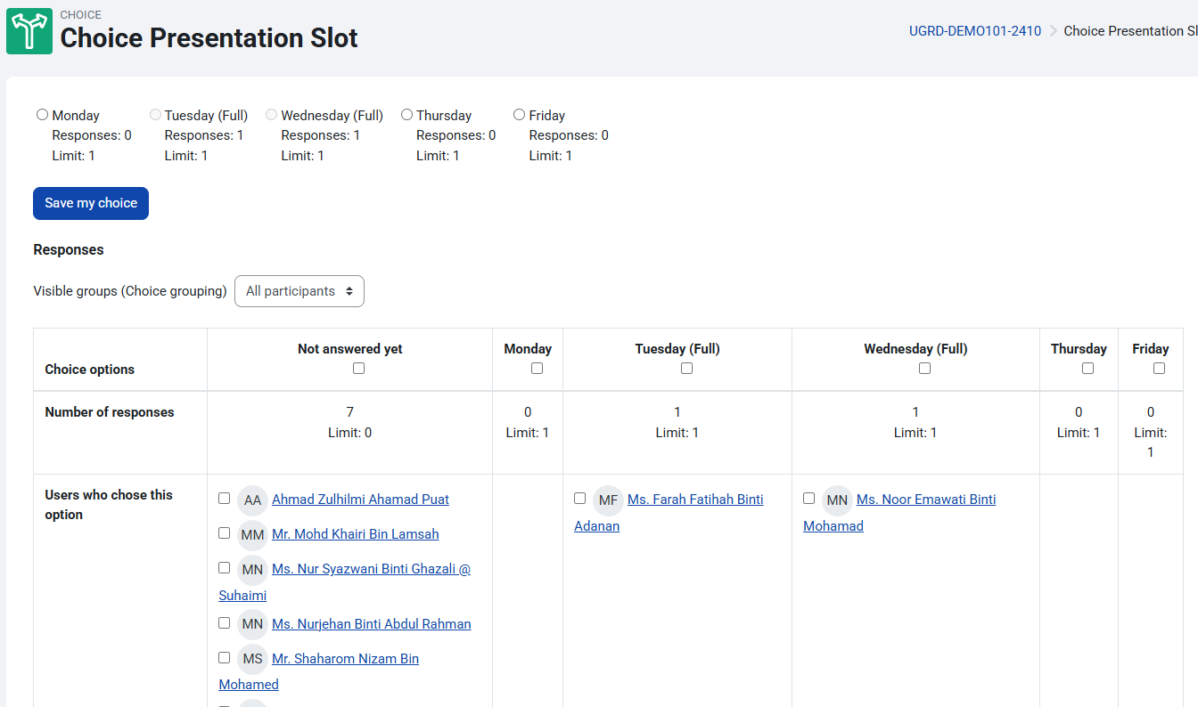 Choice options may be restricted so only a certain number may make a particular selection, and you can also opt to display a column showing who have not made their selection.